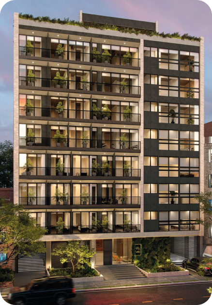 El edificio cuenta con 7 pisos de vivienda, un primer piso donde encontrará el Lobby y algunas zonas comunes como gimnasio equipado y zona de coworking, además de una terraza social en el último piso y sótano con parqueaderos para propietarios y depósitos. Estará conformado por 42 apartamentos con áreas construidas desde 31 m2 hasta 93 m2, de 1 y 2 alcobas.